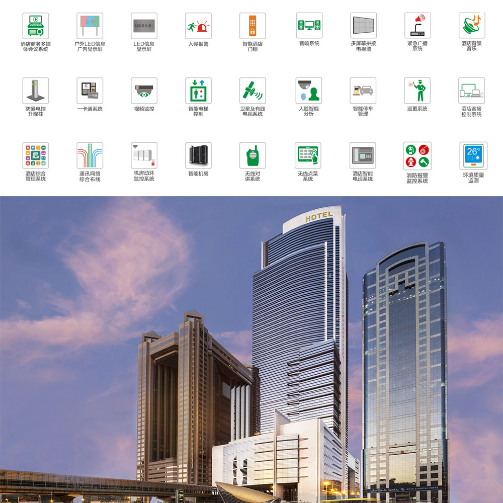 針對(duì)以上三大領(lǐng)域,可對(duì)酒店智能化系統(tǒng)劃分為以下系統(tǒng):